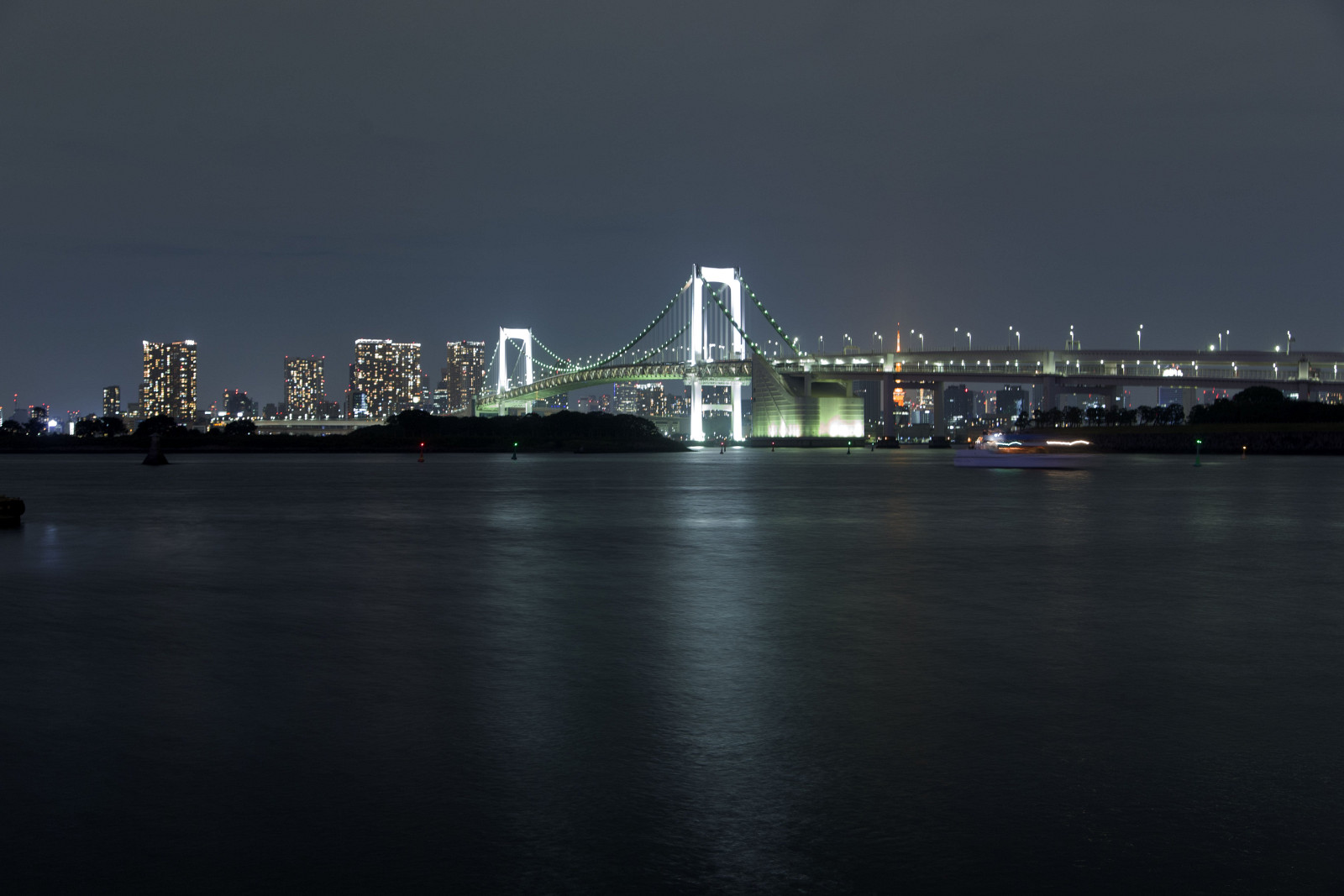 Tokyo Bay by night. The Rainbow Bridge, completed in 1993, spans northern Tokyo Bay between Shibaura Pier and the Odaiba waterfront development in Minato