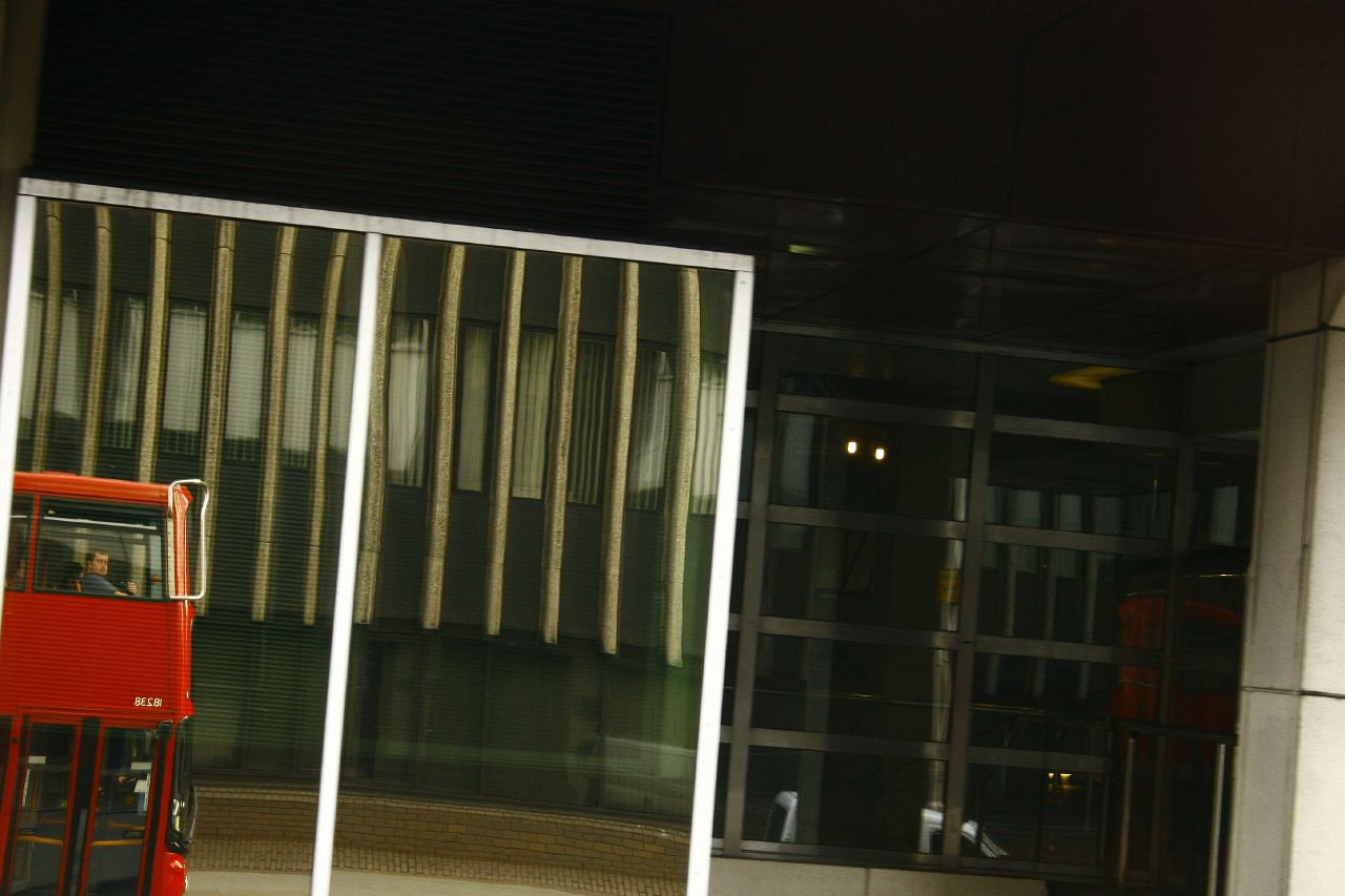 Being silly on a bus with reflections in windows as I pass
