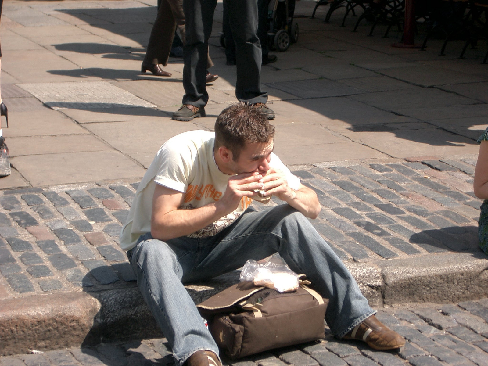 Tasty man enjoys hot sandwich