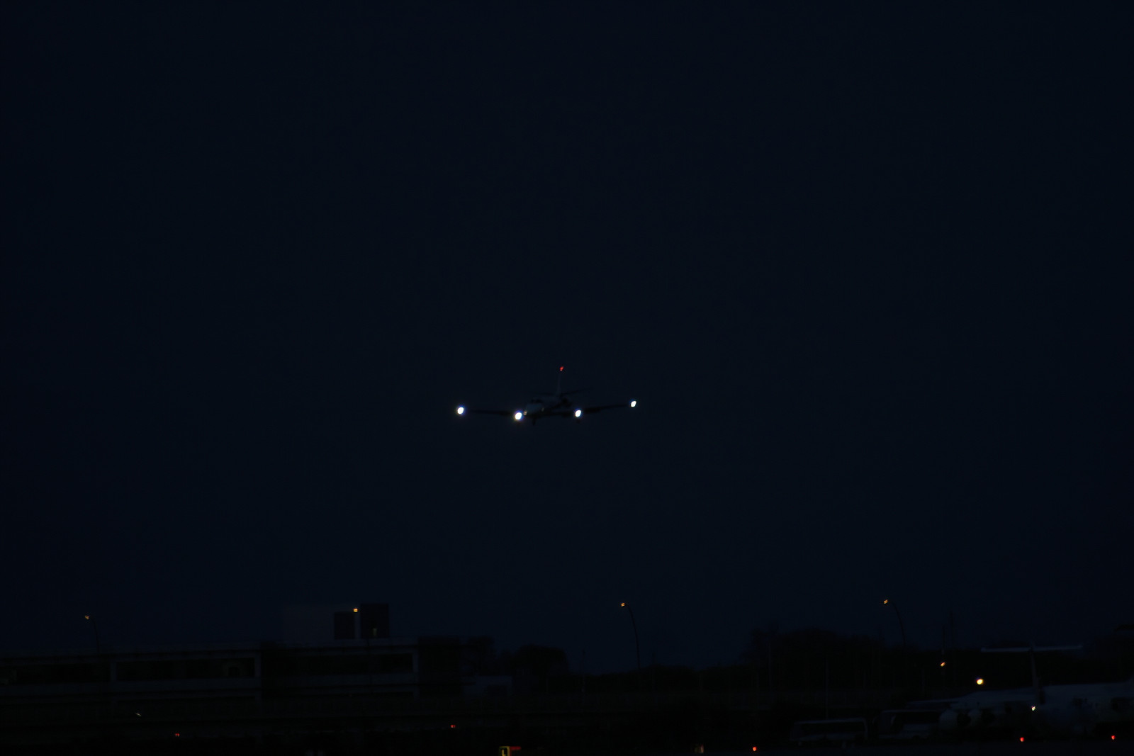 plane comes in to land in the dark
